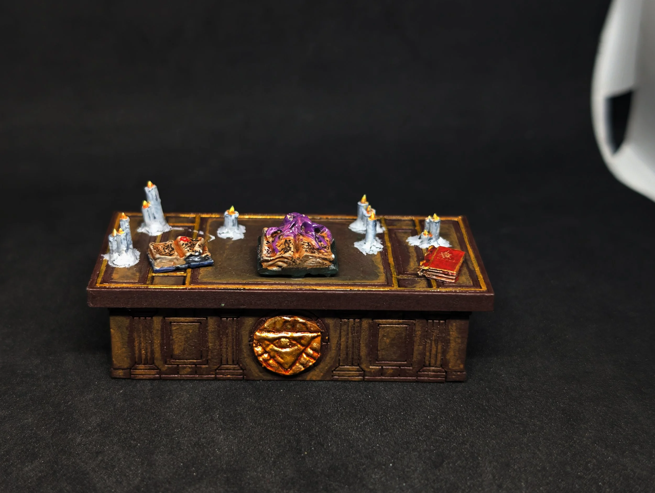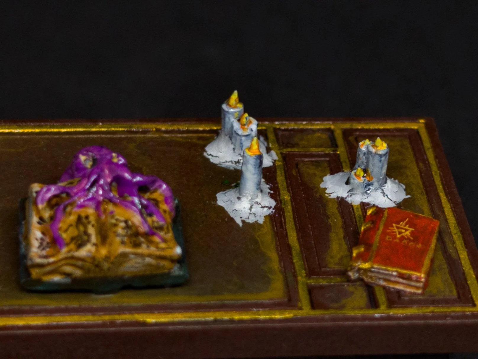 For this experiment, I wanted to take the altar from the Chisea di San Paternian that I made more Church of Dagon a little bit further. To do this, I added some books and candles, but the candles didn’t look right being stood up as the models were. I got the idea of using UV resin to make a melted wax effect, which I think turned out really well, and makes the candles look even better.