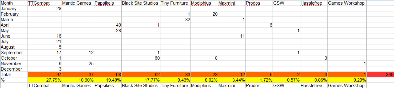 I tracked all of the models I painted this year and compiled them into a table where I could track how many models were painted each month, which companies made the models, and what percentage those companies made up of the overall number of models.