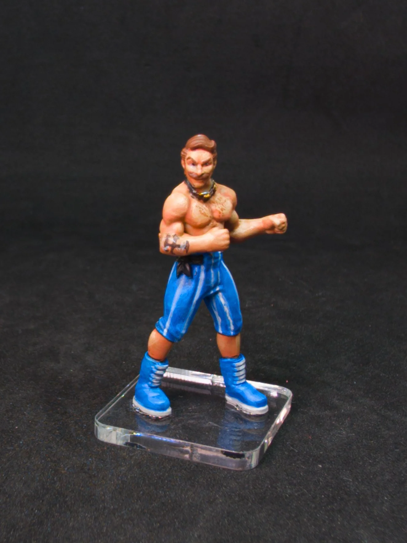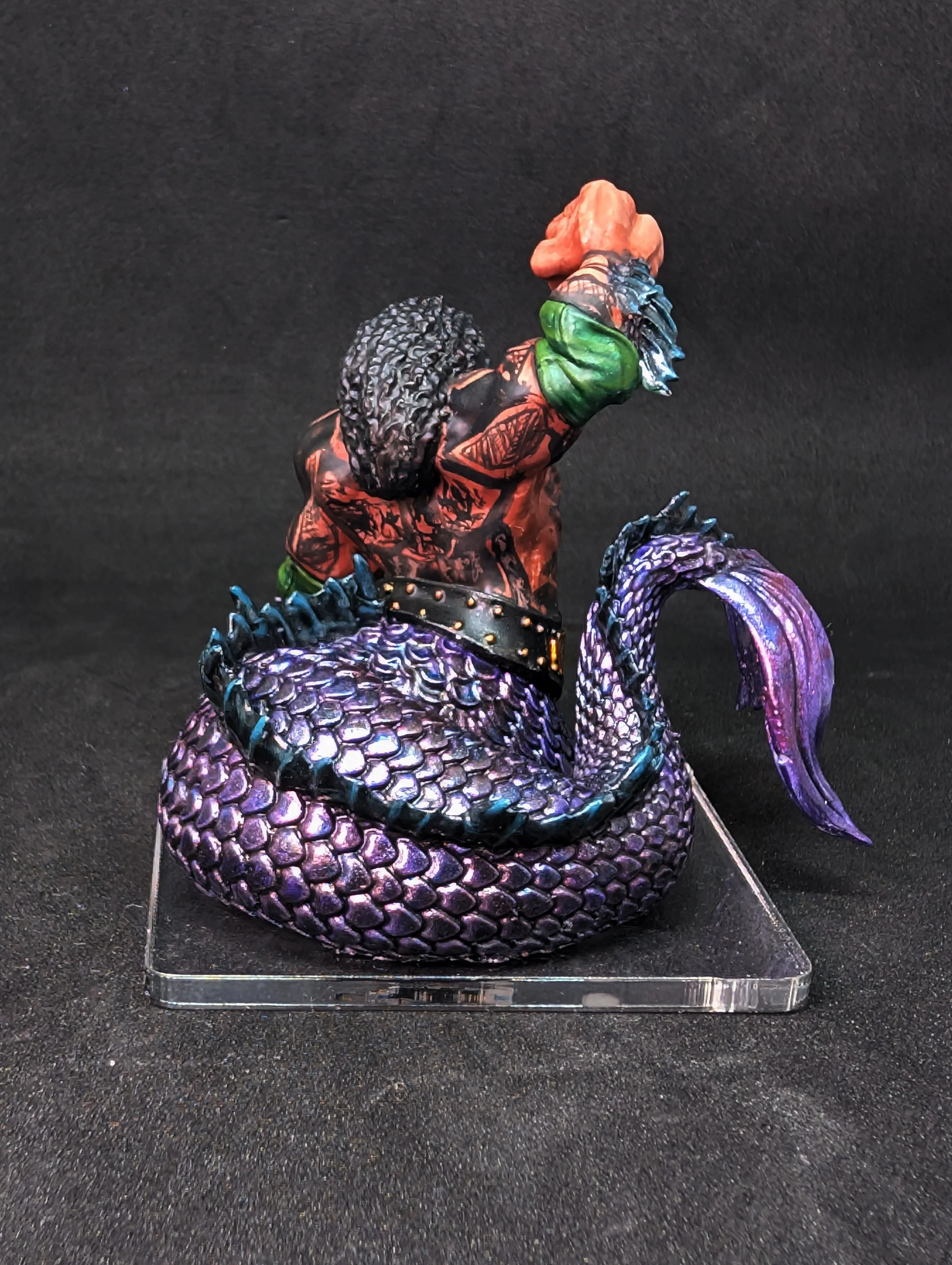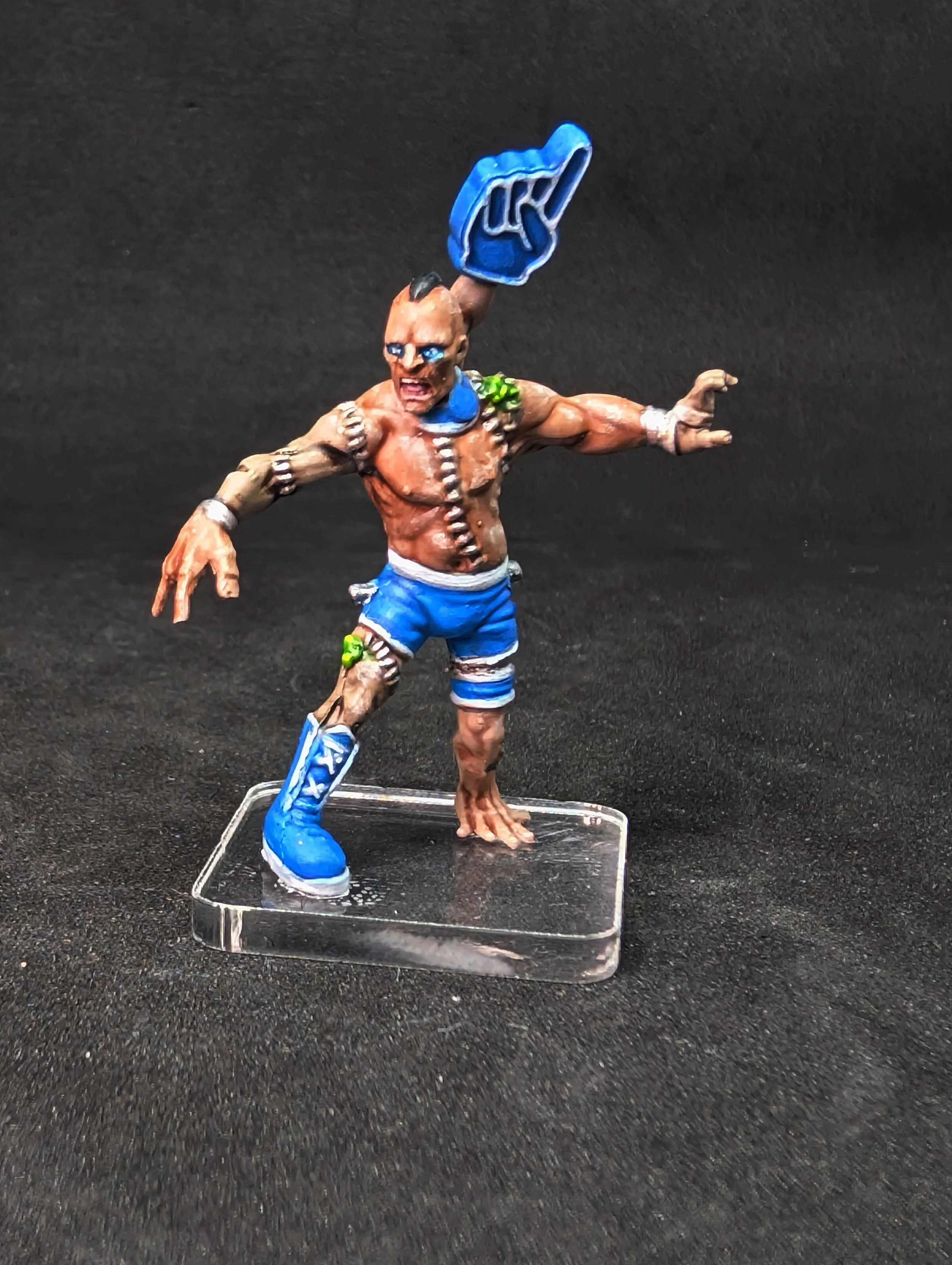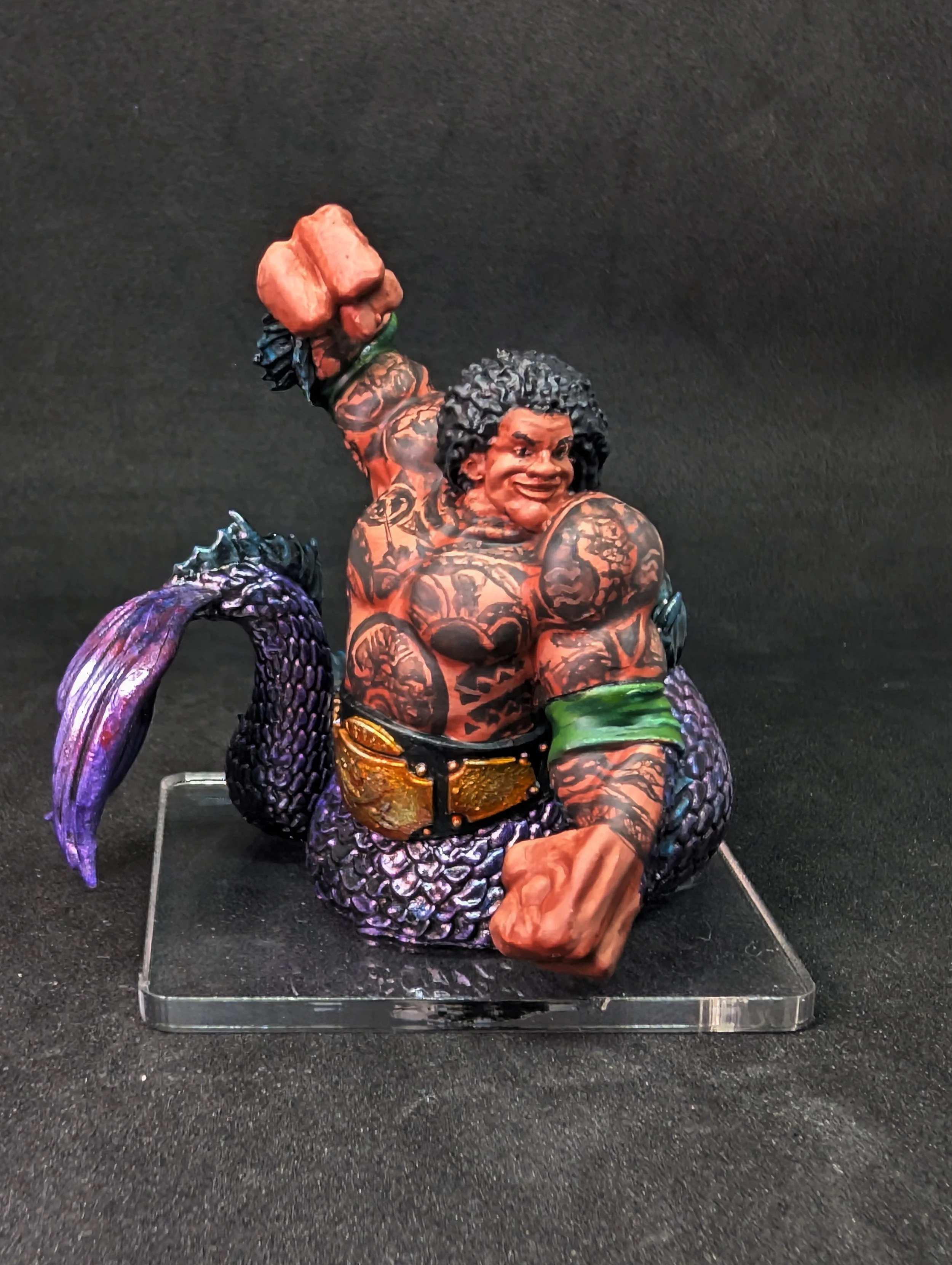These Superstars are part of Pieces of D8, and have very different styles. Ikatere is a Polynesian God inspired model, similar to Maui from Moana. He is the model I’ve painted the most tattoos on, and added a bunch of Easter Eggs to. The tattoos on his body are based on the ones Maui has, depicting the stories of how he created the world for the people, but the tattoos on his arms depict the most important parts of Rumbleslam’s history, including Ikatere’s first time winning the Championsip belt and when he faced off against Gun in RumbleMania 18. I enjoyed painting the fish tail on this guy using metallics and stippling on different colours, Purple, Blue and Red